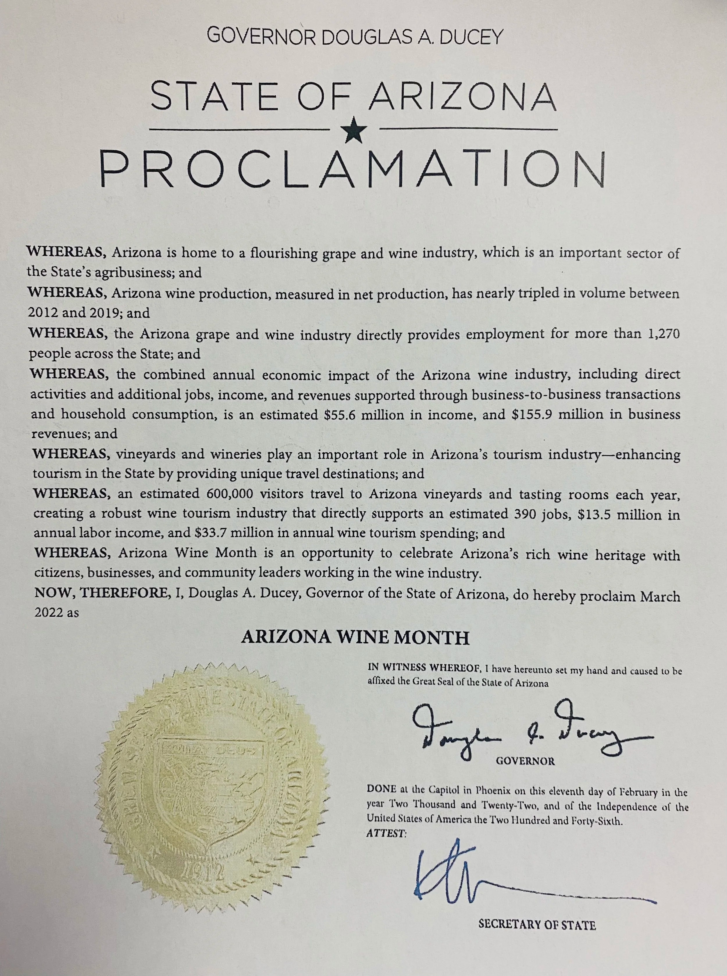 Arizona Wine Month is now March, as proclaimed by AZ Governor Doug Ducey.